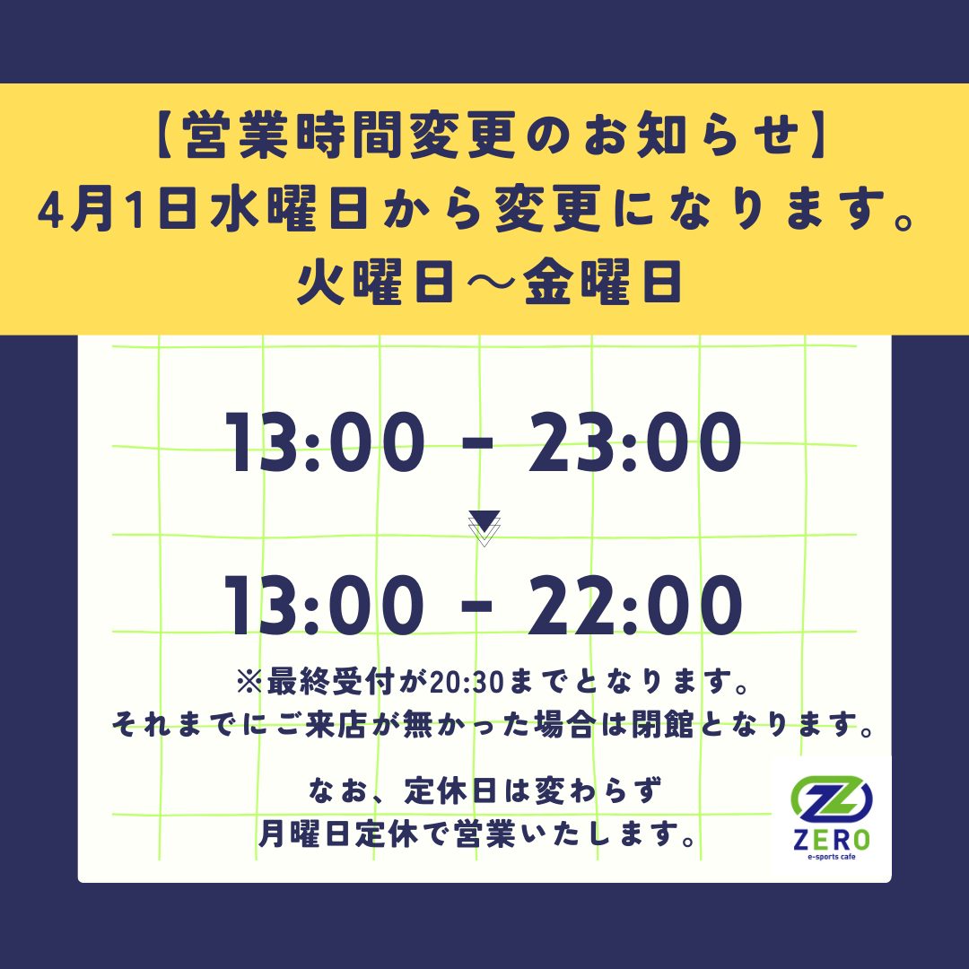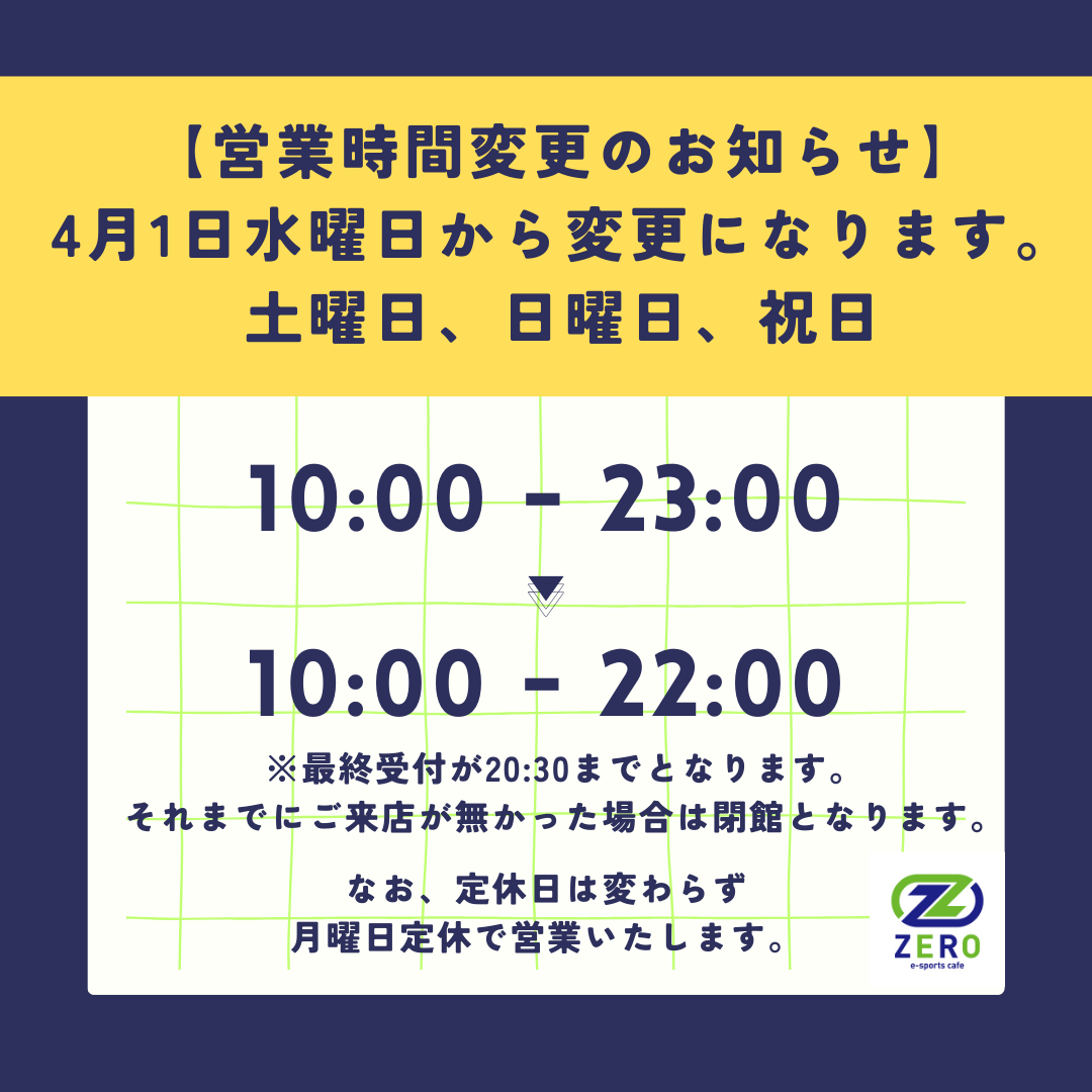 【営業時間変更のお知らせ】 2026.03.03 最終更新日時 : 2026.03.03 ZERO 📢【営業時間変更のお知らせ】 いつもご利用ありがとうございます! 2026年4月1日より営業時間が変更となります。 ■ 火曜日~金曜日 13:00~23:00 ⬇ 13:00~22:00 ■ 土曜日・日曜日・祝日 10:00~23:00 ⬇ 10:00~22:00 ※最終受付は【20:30】となります。 20:30までにご来店がない場合は、その時点で閉店させていただきます。 なお、月曜日はこれまで通り定休日です。 ご理解のほどよろしくお願いいたします。 今後ともよろしくお願いいたします🙇♂️
